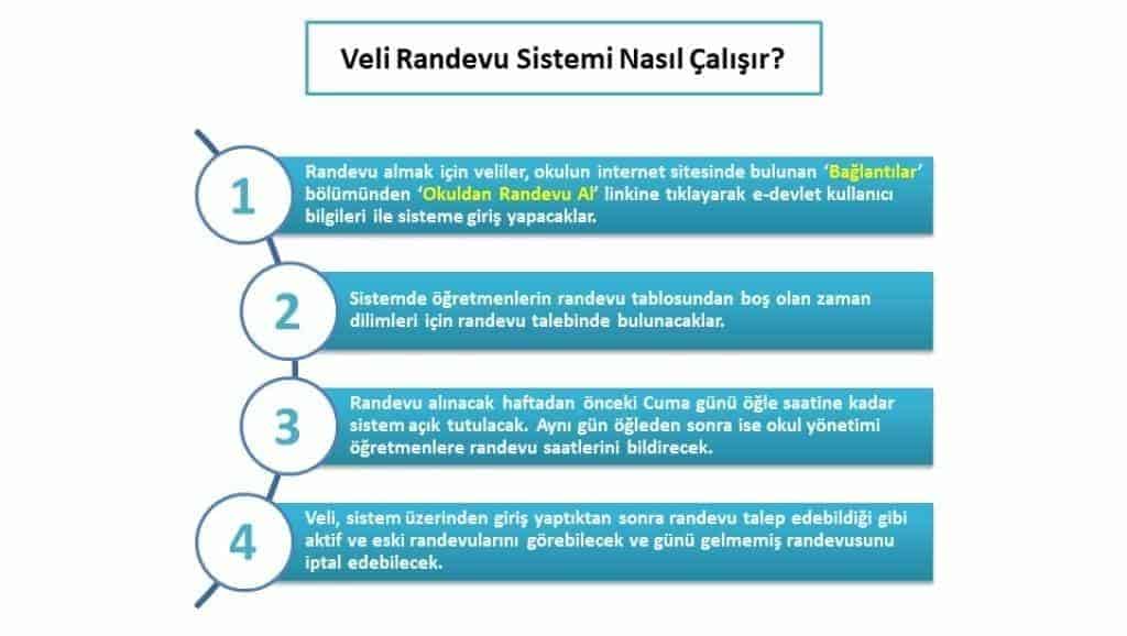 Milli Eğitim Bakanlığımız, velilerin okul müdürü ve öğretmen görüşmelerini dijital ortama taşıyan ‘Veli Randevu Sistemi’ni 25.03.2024 tarihi itibariyle hayata geçirdi. Artık veliler, öğretmen görüşmeleri için e-devlet kullanıcı bilgileriyle okulumuz internet sitesinden randevu alabilecek...